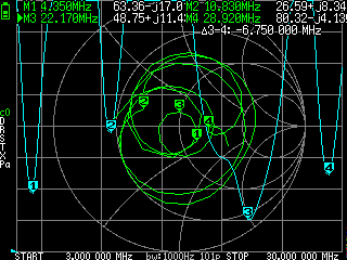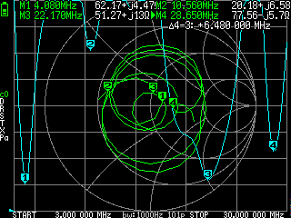 The first nanoVNA scan is with this setup and only one of the clamp-on ferrite beads. These scans are from 3.0 Mhz to 30 Mhz and show varying numbers of SWR low points. The dogleg for dip #3 ~might~ be where the coax wasn’t taped as closely to the mast as at other points.