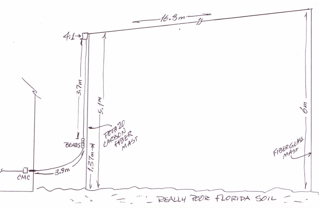 Now, let’s try again with variations. This time I’ll use two masts with the transformer and coax raised off the ground as follows. The old, broken, fiberglass mast raises the transformer and dangling feed line to 5.1 meters. A “Pota20” carbon fiber mast raises the other end of the 16.8 meter wire to 6 meters above ground. The remaining portion of the dangling coax (ABR 400) enters the shack (actually my lanai) through a bulkhead connector and is immediately met with a homebuilt* common mode choke (CMC).