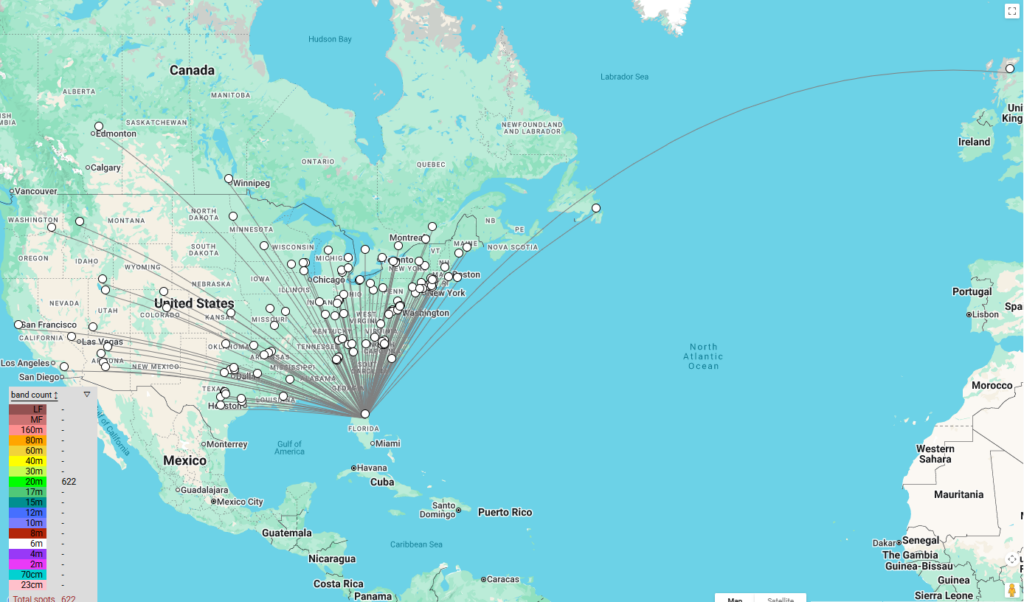 We send out a standardized weak signal transmission, typically 0.2 watts, and watch for responses from WRPR reporting stations around the world. The number of spots and their signal strength reports give us an assessment of how well an antenna is operating.