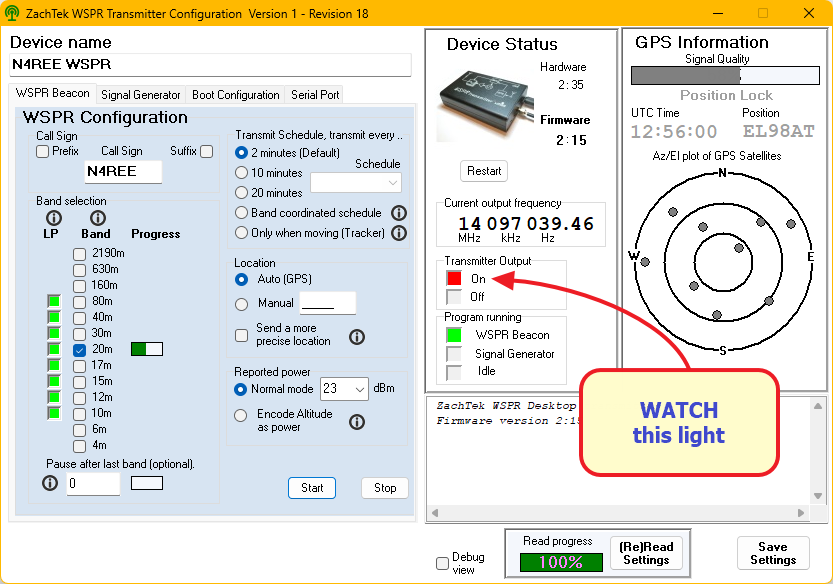 - Set up the WSPR transmitter and use a PC to control the transmitter. Set the callsign, grid square, and band for the test.